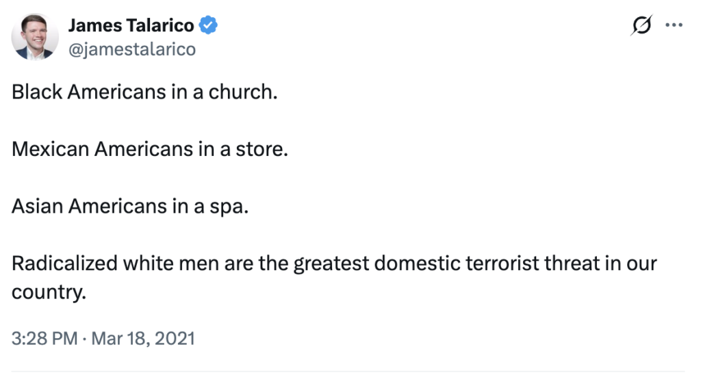 “As a white man, I’m susceptible to the same radicalization. Thankfully, I was exposed to diversity at a young age and explicitly taught the values of equality, inclusion, and justice,” Talarico added.