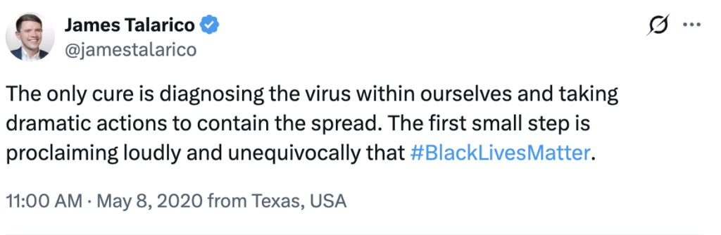 “The only cure is diagnosing the virus within ourselves and taking dramatic actions to contain the spread. The first small step is proclaiming loudly and unequivocally that #BlackLivesMatter,” Talarico typed out in May 2020, just weeks before the summer of rage commenced.