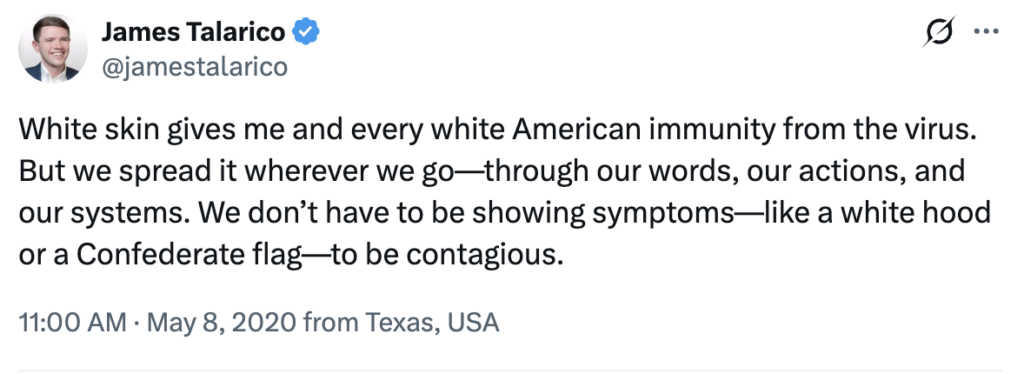 Forget Covid. Racism, according to Talarico, is a virus that is highly “contagious,” even if a white male like himself isn’t “showing symptoms.”