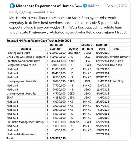 “[W]e did write to Kamala Harris and the DNC – multiple times – warning them about Tim Walz & his incompetence, fraud scandals and retaliation,” a post on the Minnesota Staff Fraud Reporting Commentary (formerly, Minnesota Department of Human Service Employees) X.com account explained Monday: