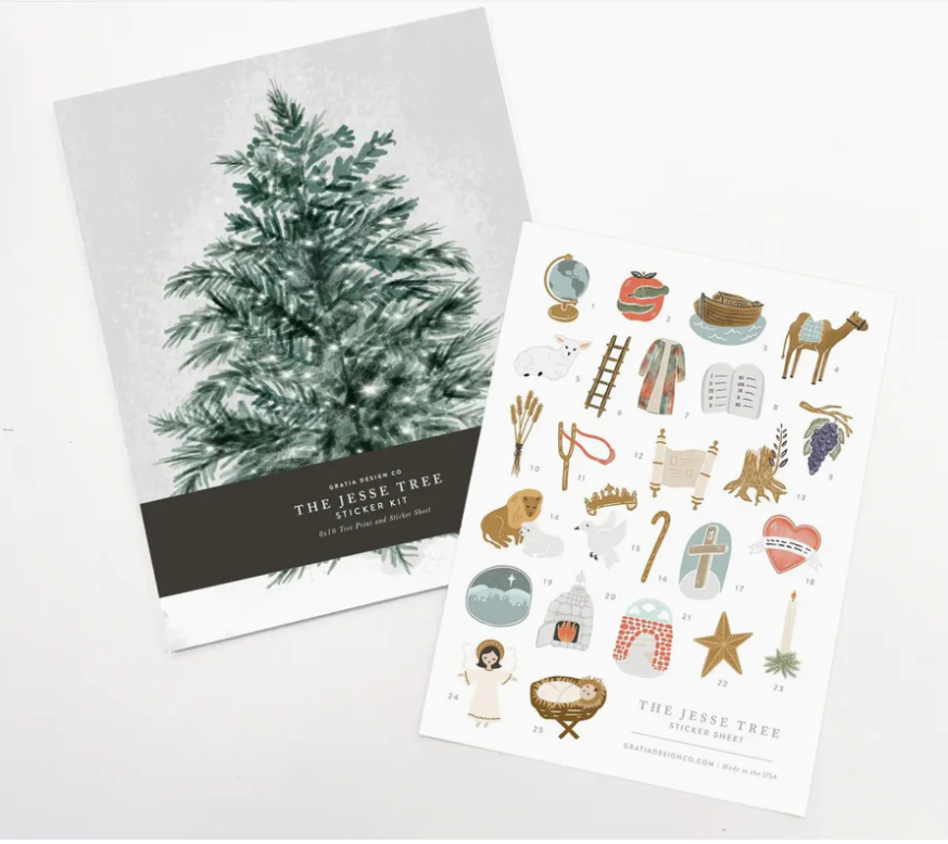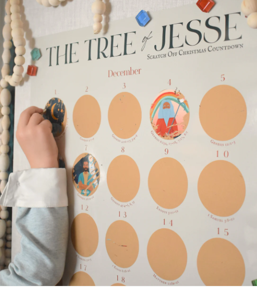 Studio Senn, another small Christian business, has a lovely, definitely Christ-focused scratch-off Jesse Tree Advent calendar ($20). I hope her Jesse Tree window clings come back into stock soon because those are another fabulous option.