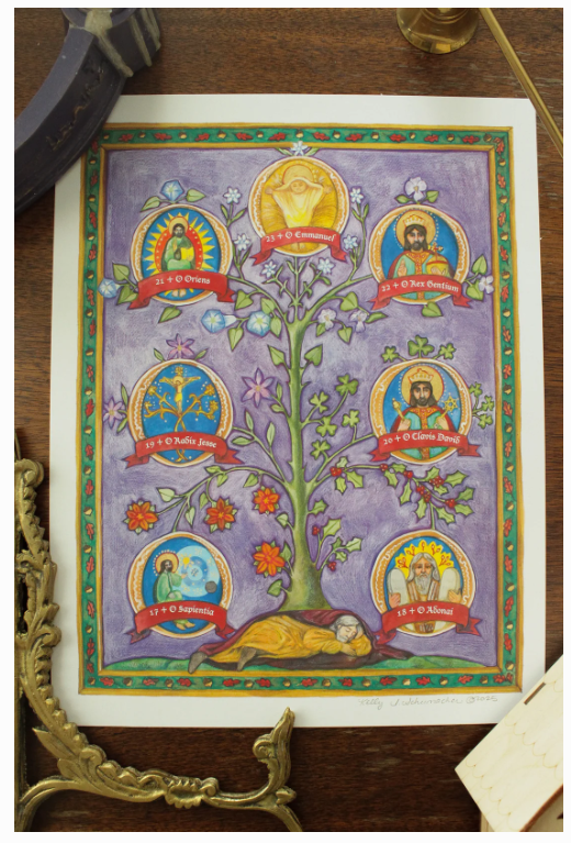 I use Studio Senn’s O Antiphon cards for the last eight days of Advent. Another beautiful option is this relatively new O Antiphons package of artwork and meditations by Kelly Schumacher via All the Household.