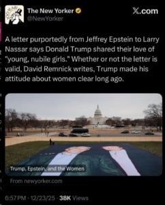 And hammering that home, the New Yorker tweeted out a fake story by its editor, David Remnick, mentioning a fake letter by Jeffrey Epstein to Larry Nassar: an infamous sex abuser.