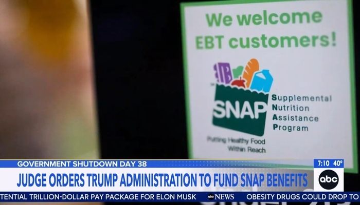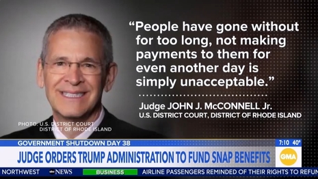 [T]his morning, a federal judge accusing the White House of withholding federal food assistance for political reasons and ordering the administration to fully distribute SNAP benefits by today. Judge John McConnell saying: “People have gone without for too long, not making payments to them for even another day is unacceptable.”
