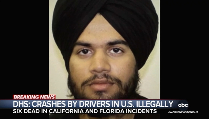 MATT GUTMAN: Tonight, this dash cam video of a chain reaction crash that left three people dead on a California highway, now at the center of an investigation and the debate over immigration. The driver behind the wheel of a tractor trailer facing charges of vehicular manslaughter while intoxicated, for causing that horrific crash on the 10 freeway east of Los Angeles. 21-year-old Jashanpreet Singh of India was driving with a valid California commercial license, but ICE officials say he was in the country illegally. It comes after another deadly crash in Florida. The Department of Homeland Security says this driver, also with a California commercial driver’s license and in the country illegally, allegedly made a reckless U-turn on the Florida Turnpike, causing a crash that also killed three people. California officials say that driver in Florida had a work permit at the time he was issued a license. Tonight, this latest crash in California is under federal investigation and among the victims killed, a high school basketball coach and his wife. And tonight, The White House weighing in.