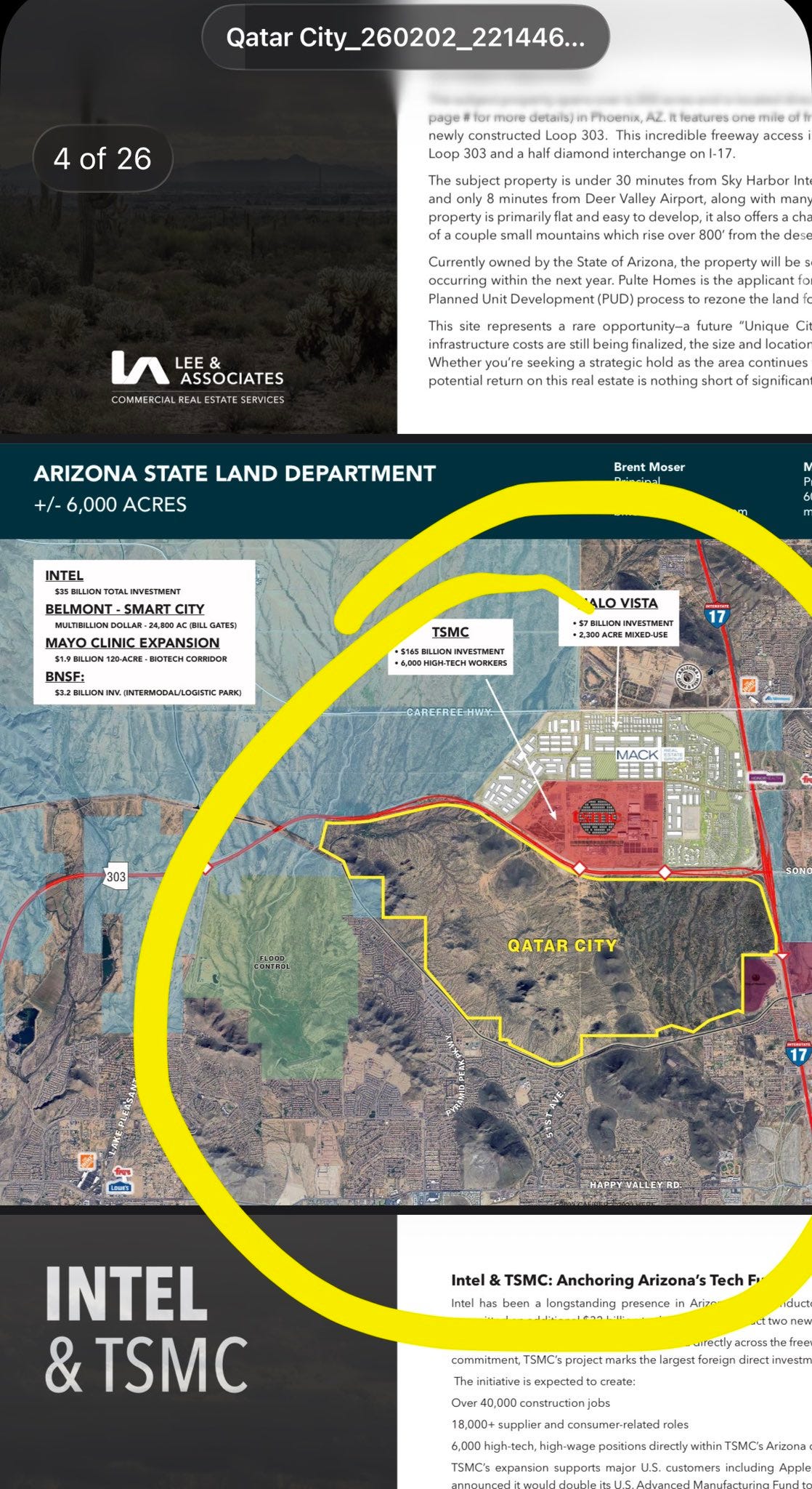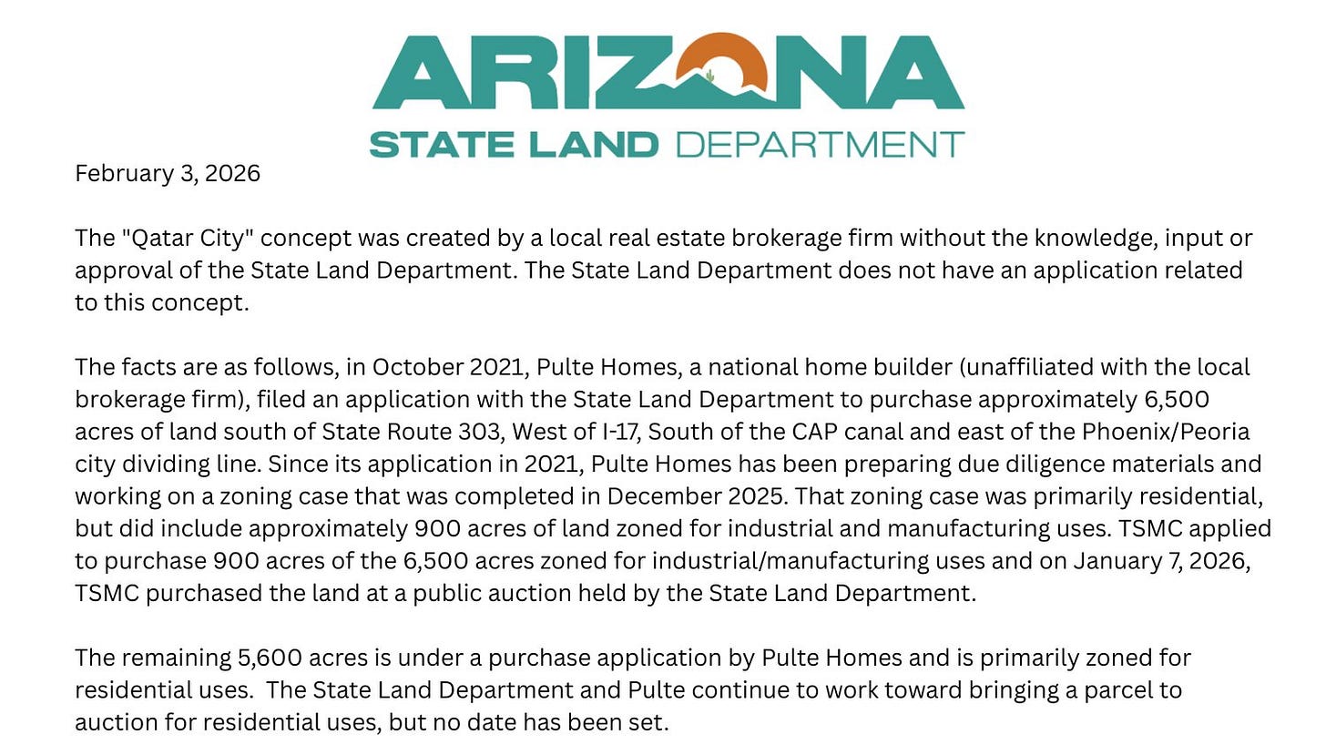 On February 3, 2026, the Arizona State Land Department issued a statement saying the “Qatar City” concept was created by a local real estate brokerage firm without their knowledge or approval. They clarified that the land in question is under a separate application by Pulte Homes, with 900 acres already sold to TSMC for industrial use.