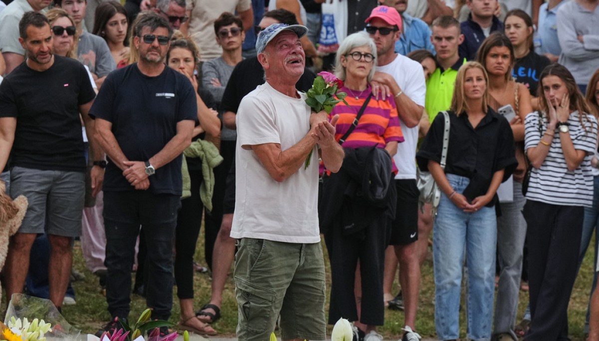 A man gestures as he lays flowers at a tribute for shooting victims outside the Bondi Pavilion at Sydney’s Bondi Beach, Monday, Dec. 15, 2025, a day after a shooting. (AP Photo/Mark Baker)