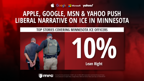 Methodology: During the time period Jan. 8, 2025 – Jan. 9, 2026, MRC researchers examined the top 20 of AllSides-rated news stories featured on Apple News (the app) and web versions of Google News, MSN and Yahoo! News each day at approximately 10:00 AM EST. MRC researchers used the AllSides media bias ratings, which categorize an outlet as “left,” “lean left,” “center,” “lean right” or “right” to determine the overall bias presented by Apple News and analyzed the results.