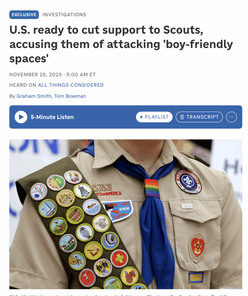 Now “woke” Scouting is back in the news, thanks to National Public Radio (NPR) obtaining leaked materials and attributing them to U.S. Secretary of War Pete Hegseth.