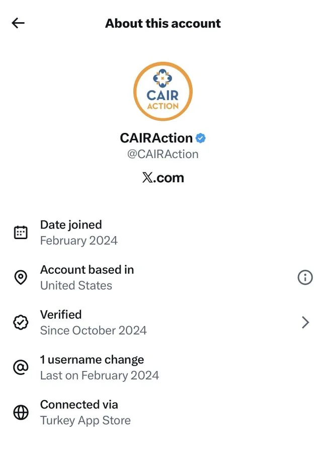 But what was more relevant outside the social media echo chamber was the foreign status of organizational accounts. The top story is that CAIR Action’s account appears to have been connected via Turkey’s app store.