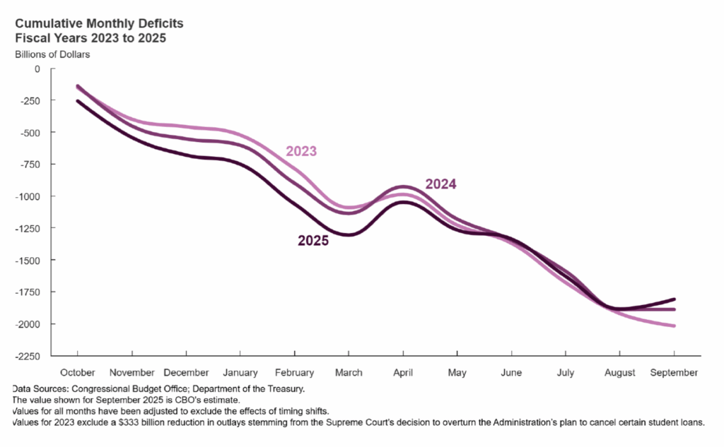 All told, CBO concluded that the budget deficit in the most recent fiscal year exceeded $1.8 trillion, a mere $8 billion (less than a fraction of 1 percent) less than in fiscal 2024. There were various timing shifts underlying those numbers; both revenue and expenses normally paid in fiscal 2023 got shifted into fiscal year 2024, which slightly alters the comparisons between fiscal 2024 and fiscal 2025 (the year just concluded).