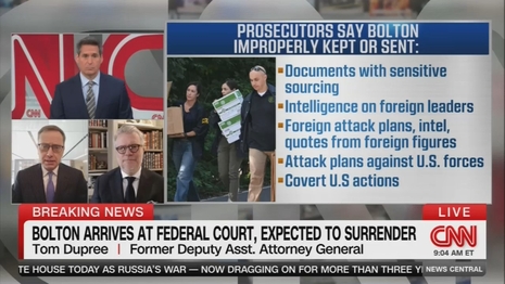BERMAN: Michael, let me read to you in the indictment where it says, “On or about July 23rd, 2018, Bolton sent individuals one and two a 24-page document which described information that Bolton learned while national security advisor. Less than three hours later, Bolton sent individuals one and two a follow up message that stated, ‘none of which we talked about” – three exclamation points. In response, individual one sent a message that stated, “Shhhhh.” So, how does that state of mind, Michael, maybe acknowledge that this needed to be kept quiet? How could that impact the case?