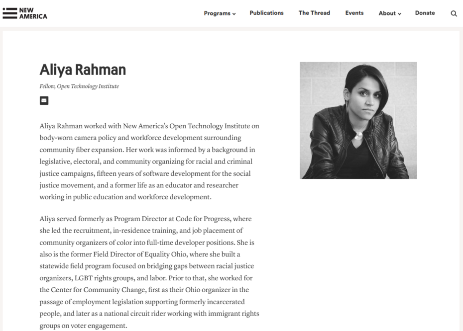 A simple Google search for her name turn up her employment page for New America, a left-wing organization, which listed her as their fellow from the Open Technology Institute.