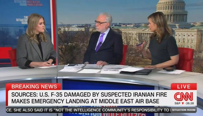 Co-host Wolf Blitzer began by reporting, “We’re also following some major breaking news right now. Sources telling CNN, an American F-35 fighter jet had to make an emergency landing after coming under suspected Iranian fire.”