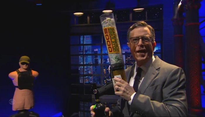 Sticking with the CBS brand, Colbert played the part of a CSI (Criminal Sandwich Investigation) agent, “To truly determine whether an officer could be in danger from a high-velocity hoagie, the Late Show‘s crack forensic squad has recreated the exact hoagie conditions in D.C. that night, using the latest state-of-the-art Sandwich Simulator 5000. Which is definitely not just a T-shirt cannon with a $5 footlong shoved in it. Everybody stand back. I don’t want you filling up before dinner. Ready. Aim. Sandwich!”