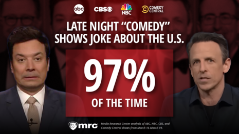 NewsBusters analysts examined 19 episodes from Monday, March 16, through Thursday, March 19, including three from CBS’s The Late Show with Stephen Colbert and four each from ABC’s Jimmy Kimmel Live!, Comedy Central’s The Daily Show, and NBC’s Late Night with Seth Meyers and The Tonight Show Starring Jimmy Fallon. They found that 114 out of 118 jokes related to the war were about the United States.