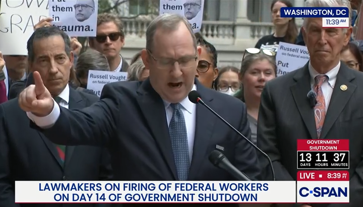 In speeches, Democracy Forward was mentioned and thanked by several lawmakers, applauded by the crowd, and Rob Shriver, managing director of the Civil Service Strong and Good Government Initiatives at Democracy Forward, was given time to speak.