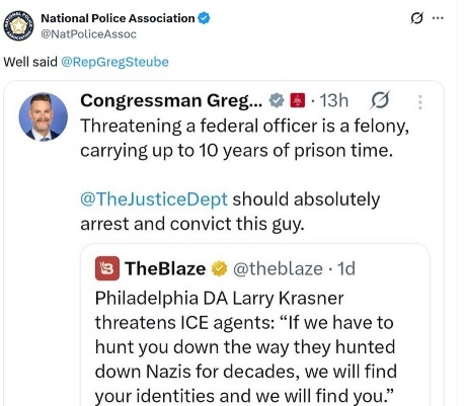 “Well said,” the National Police Association responded Thursday after Rep. Greg Steube (R-Florida) called on the U.S. Justice Department to prosecute George Soros-backed Philadelphia District Attorney Larry Krasner for threatening to hunt down U.S. Immigration and Customs Enforcement (ICE) agents in his city because they’re “wannabe Nazis.”