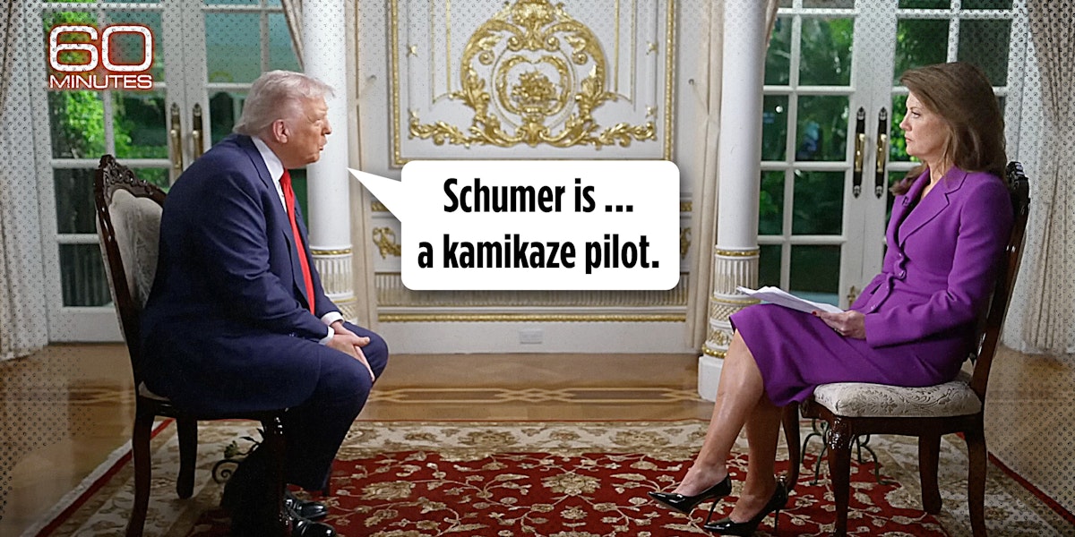 Asked by host Norah O’Donnell about the government shutdown, Trump affixed the blame right where it belongs — with Senate Democrats: “[Chuck] Schumer is a basket case,” he said. “He’s become a kamikaze pilot.”