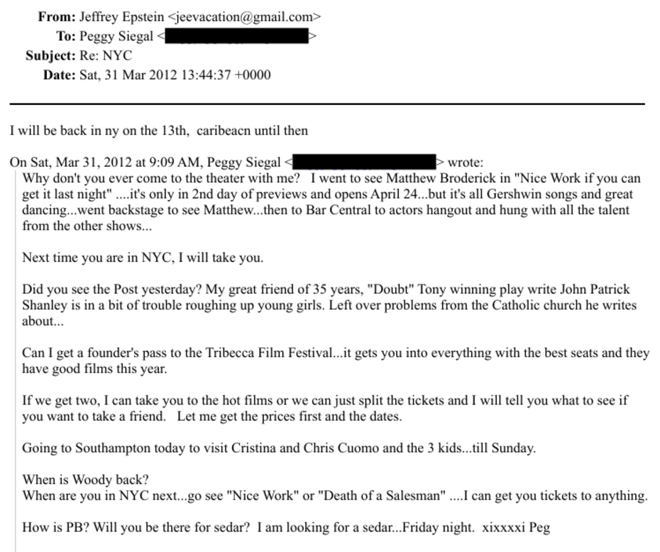 Fast forward to an e-mail sent on March 31, 2012, Siegal was whining to Epstein about how he never went to the theater with her. She was also giving him an update about happenings in her life. One of which was how she was heading out to Long Island to spend the weekend with the Cuomo family. “Going to Southampton today to visit Cristina and Chris Cuomo and the 3 kids…till Sunday,” she wrote.
