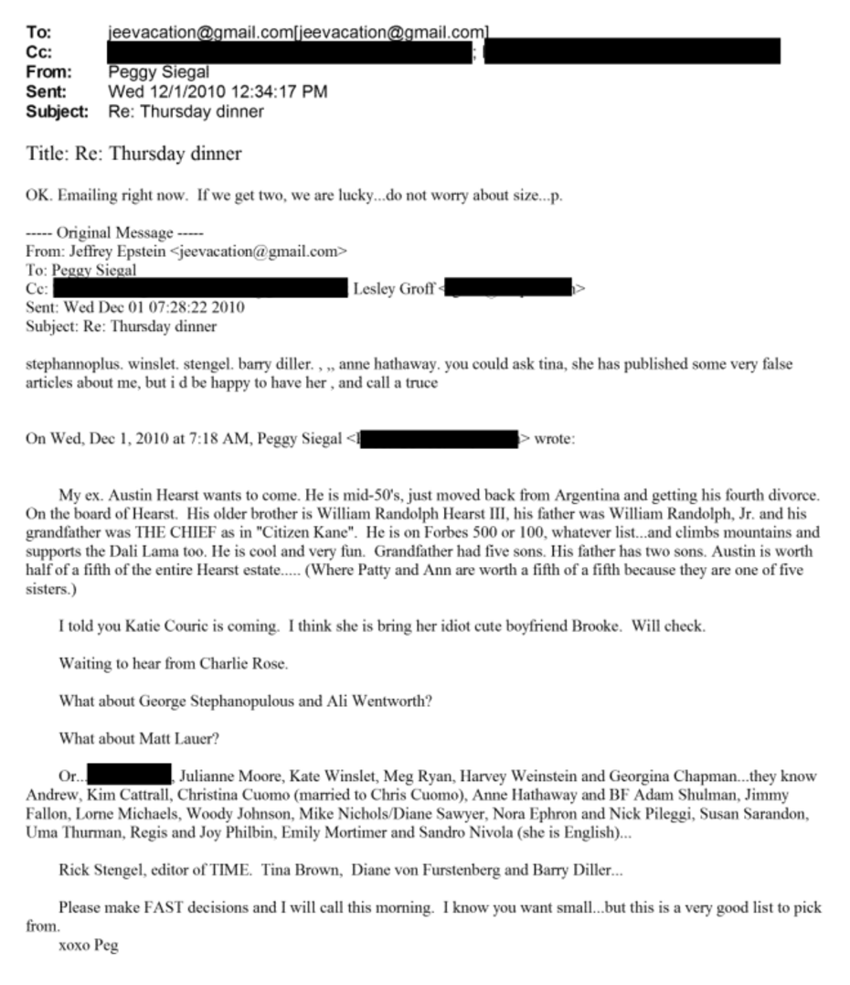 On August 10, 2010 (two years after Epstein was convicted), Siegal sent Epstein an e-mail under the subject line “Sept. 16 dinner.” The e-mail contained a massive list of over 120 names that included journalists, writers, editors, commentators, actors, and directors.