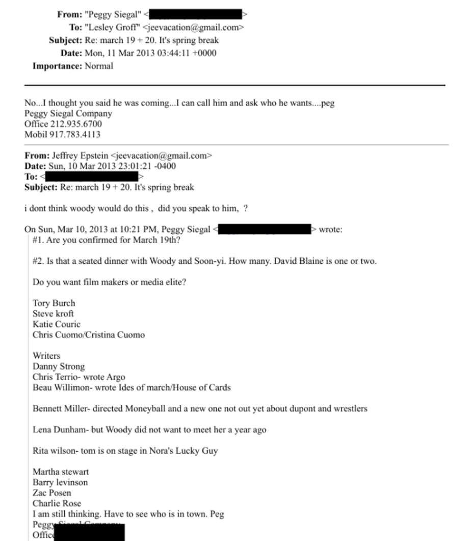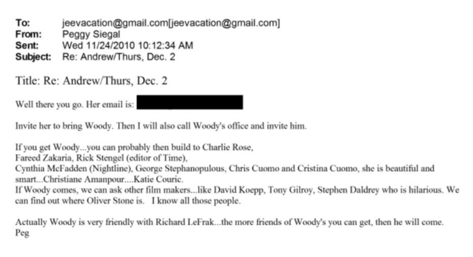 As that December 2 dinner date was quickly approaching, Epstein and Siegal wanted to nail down the final guest list and invite more people. An e-mailed “Yes list” included: “Andrew[,] Jeffrey[,] George Stephanopolous[,] Ali Wentworth[,] Woody Allen[,] Soon-Yi Allen[,] Charlie Rose (…) Katie Couric.”