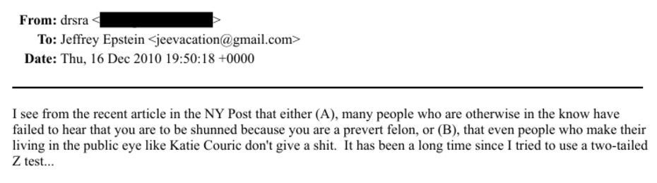 You might be asking yourself why these people would be so comfortable being around a monster like Epstein and his close associates, especially after he was convicted of child sex crimes. Well, one email sent to Epstein from a redacted e-mail address (which only went by “drsra”) had a theory as to why: