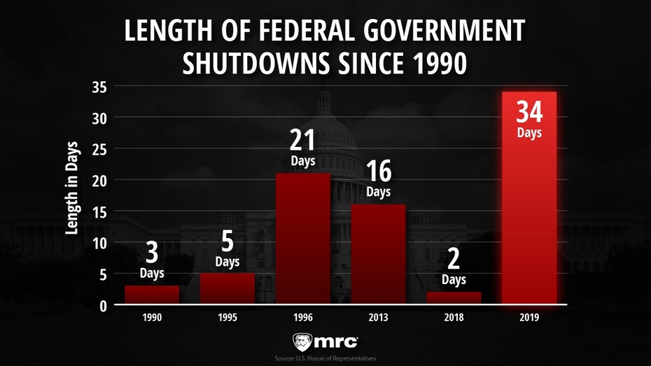 Indeed, every government shutdown since 1990 has been ended by Congress passing a continuing resolution. The six shutdowns that occurred during that period ranged in length from two to 34 days.