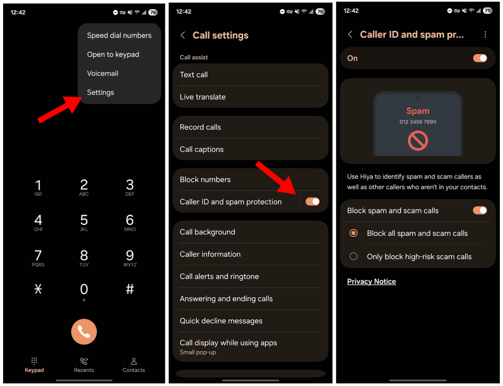 Built with the anti-spam service Hiya, Samsung’s Smart Call feature is baked directly into Samsung Galaxy phones starting with the S8 and newer. You can enable it by opening the Phone app on your Galaxy phone, tap on the three dots in the top right corner, tap Settings, and then flip on the Caller ID and spam protection toggle. Tap on this section one more time to go a bit deeper, and choose whether you’d like to block high-risk calls or spam calls altogether.