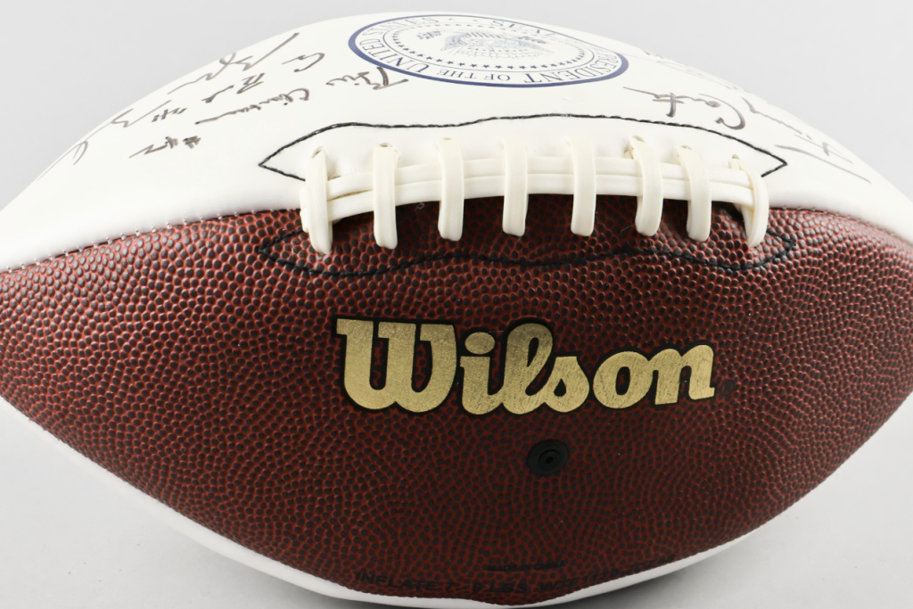 The Wilson NFL football was signed by former Presidents Jimmy Carter, George H.W. Bush, Bill Clinton, George W. Bush, Barack Obama, and Donald Trump. Most also wrote their presidential number, just like the players do when autographing items.