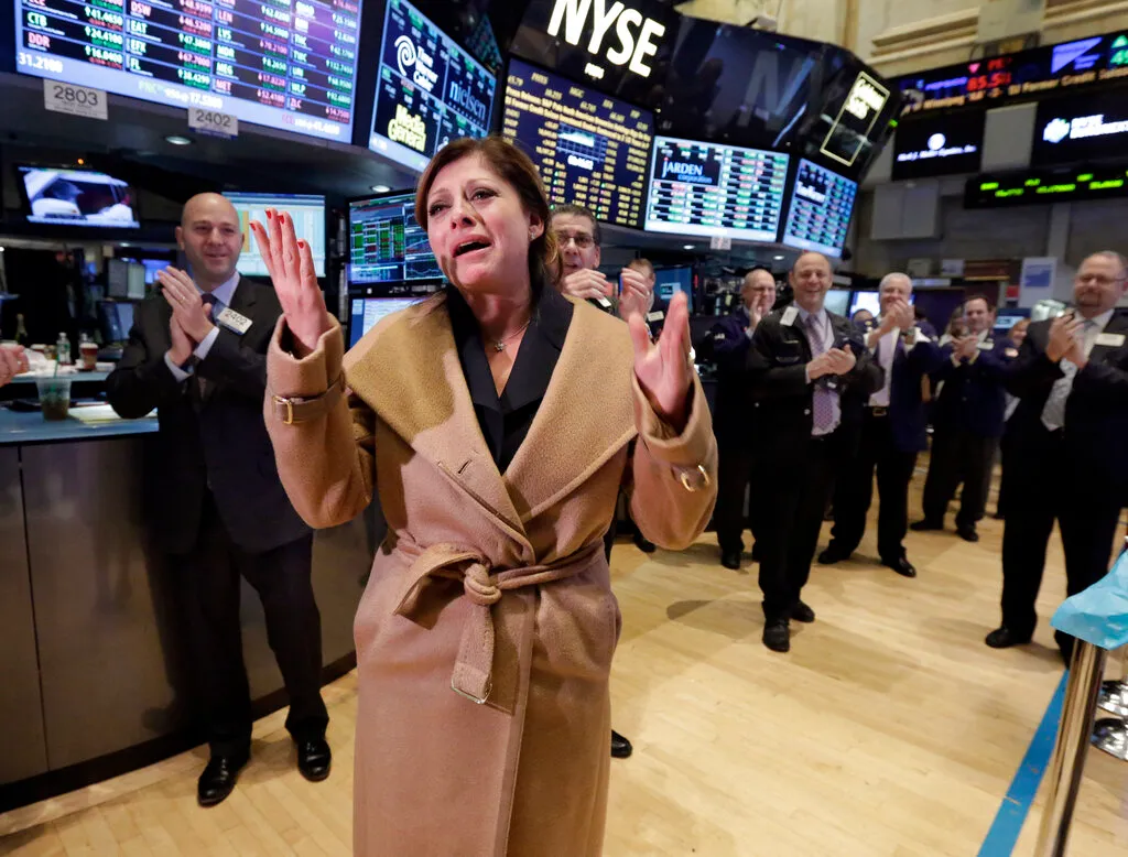 A tearful CNBC reporter Maria Bartiromo is overwhelmed as traders applaud her as she arrives on the floor of the New York Stock Exchange for her last day at the network, Friday, Nov. 22, 2013. Bartiromo is leaving the business news channel when her contract ends Nov. 24, concluding 20 years with CNBC. (AP Photo/Richard Drew)