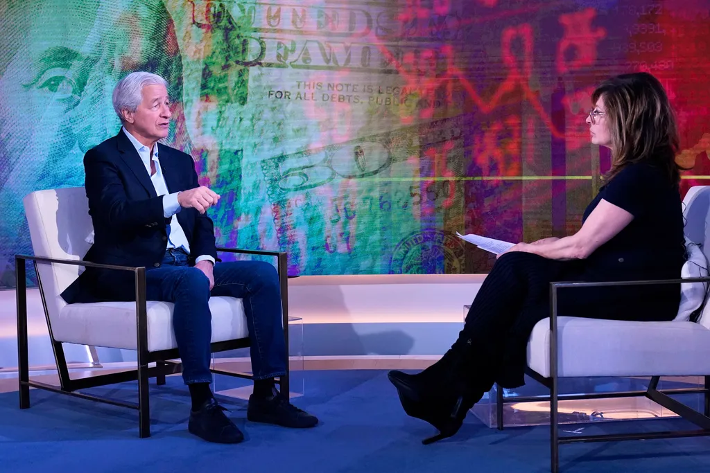 JPMorgan CEO Jamie Dimon, left, is interviewed by Maria Bartiromo on the “Mornings with Maria Bartiromo” program, on the Fox Business Network, in New York Wednesday, April 9, 2025. (AP Photo/Richard Drew)