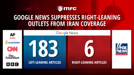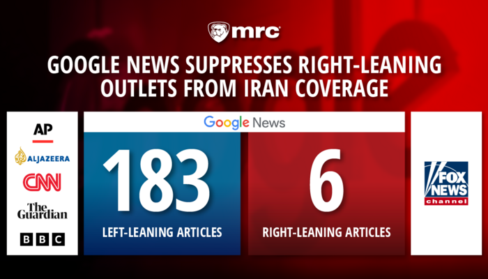 Methodology: During the time period March 1 – 31, 2026, MRC researchers examined the top 20 stories featured on Google News each day at approximately 8:30 AM ET. MRC researchers used the AllSides media bias ratings, which categorize an outlet as “left,” “lean left,” “center,” “lean right” or “right” to determine the overall bias presented by Google News and analyzed the results. Researchers additionally identified stories related to the U.S.-Israel war with Iran by analyzing headlines with key words. Key words included: “Ayatollah” “Beirut,” “Hormuz,” “Hezbollah, “Iran,” “Iraq,” “Kahmenei,” “Kharg,” “Lebanon,” “Middle East,” “Military,” “Oil,” “Tehran” and “War.”