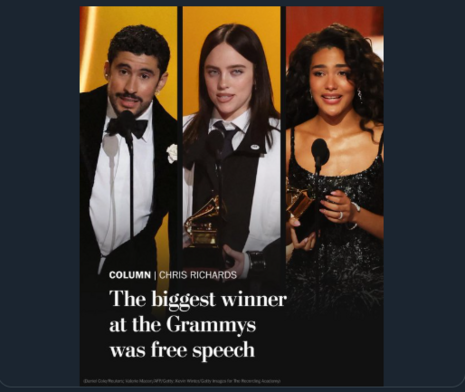 That Democrat rag The Washington Post tweeted this: “Politics are often treated like radioactive material on Grammy night, writes Post pop music critic Chris Richards. But on Sunday, something changed. The world outside had finally become too loud to ignore.” The headline underneath: “The biggest winner at the Grammys was free speech.”