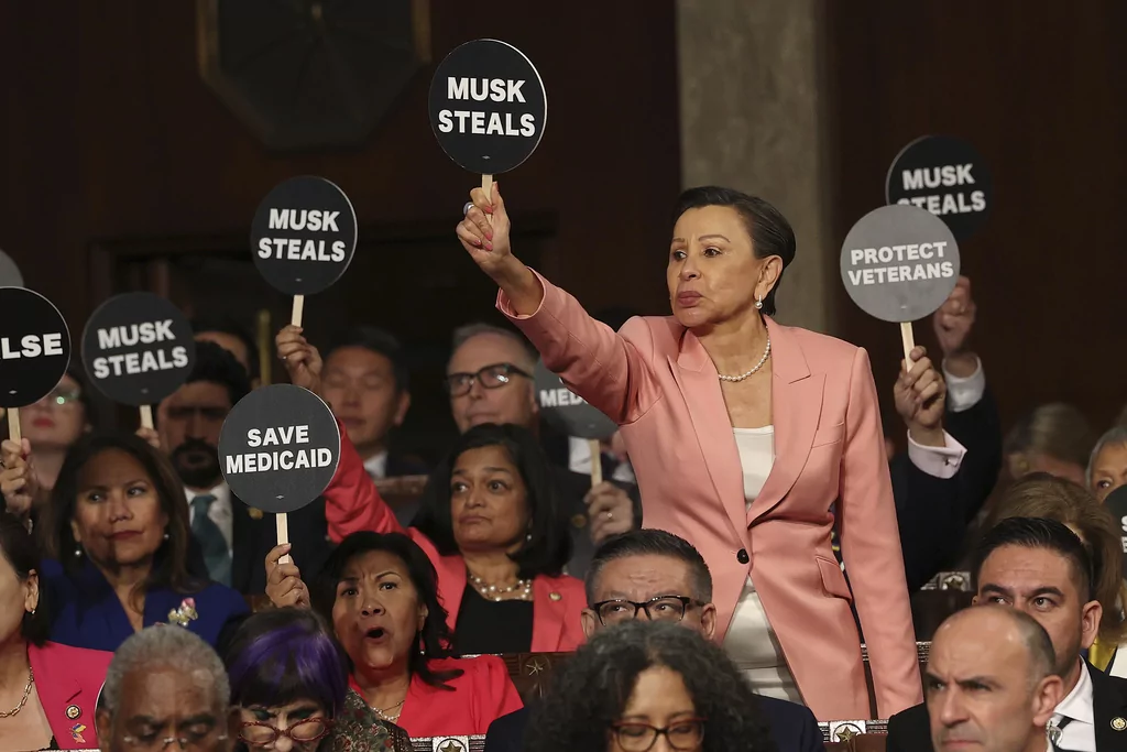 Rep. Nydia Velazquez, D-N.Y., holds a protest sign with fellow Democrats as President Donald Trump addresses a joint session of Congress at the Capitol in Washington, Tuesday, March 4, 2025.