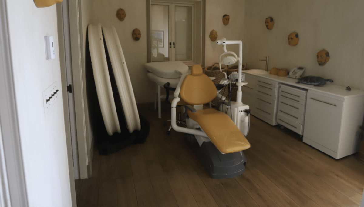 The pictures show a room with a dentist chair, a phone, a large bedroom, and a storage room, all of which are decorated predominantly white.