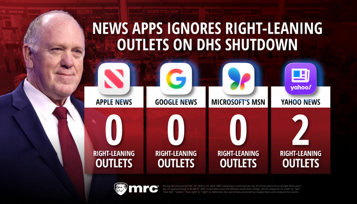 Methodology: During the time period Feb. 14 – March 14, 2026, MRC researchers examined the top 20 stories featured on the Big Four News Apps (Apple News, Google News, Microsoft’s MSN and Yahoo News) each day at approximately 8:30 AM ET and searched the article headlines for the terms “DHS,” “Homeland Security,” “shutdown” and “shut.” MRC researchers used the AllSides media bias ratings, which categorize outlets as “left,” “lean left,” “center,” “lean right” or “right” to determine the overall bias presented by the Big Four News Apps and analyzed the results.