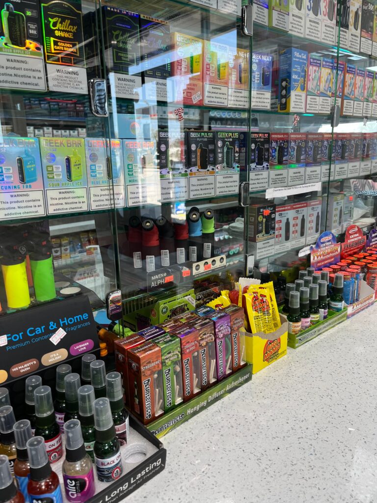 I ended up exiting those investments for a smaller profit than expected a couple of years ago, when the thesis proved false, in that the heretofore effective regulatory regime of nicotine products failed against the swarm of Chinese-manufactured vapes and Indian-owned convenience stores and smoke shops. These immigrants do not quietly comply with laws, but rather demand a level of enforcement resources our country lacks. Here’s a typical display from a recent road trip: