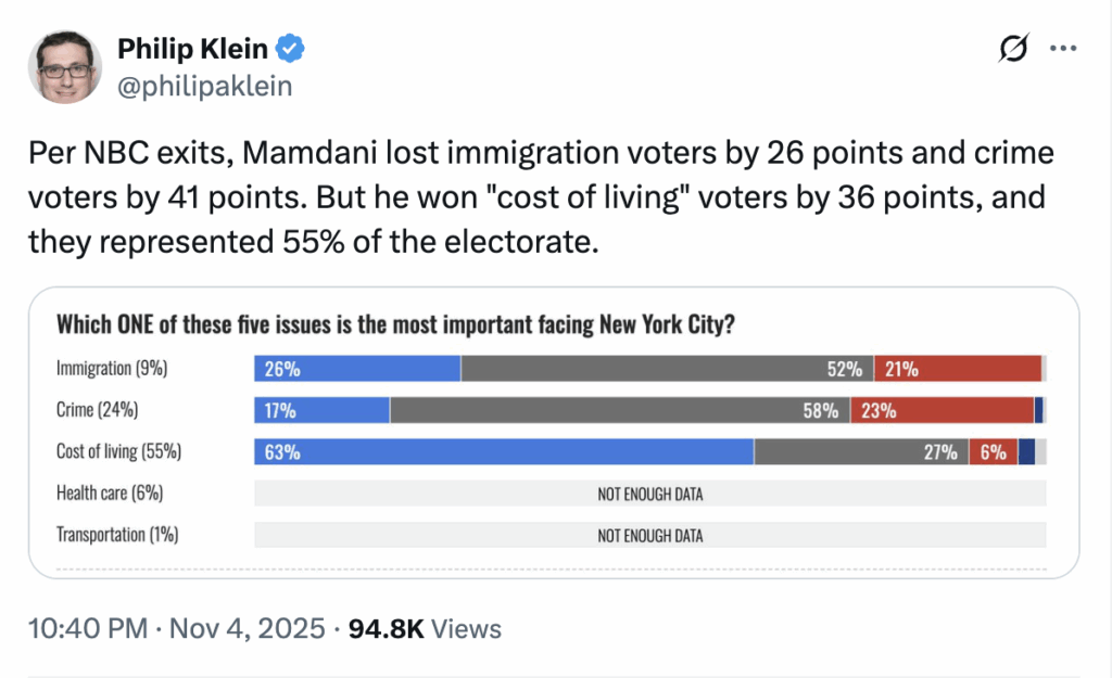 One look at the exit polling data from New York City highlights this phenomenon. Say all you want about Zohran Mamdani’s radical positions when it comes to antisemitism, socialism, and just about everything else. The majority of New York City voters are so focused on cost-of-living issues that they just didn’t care: