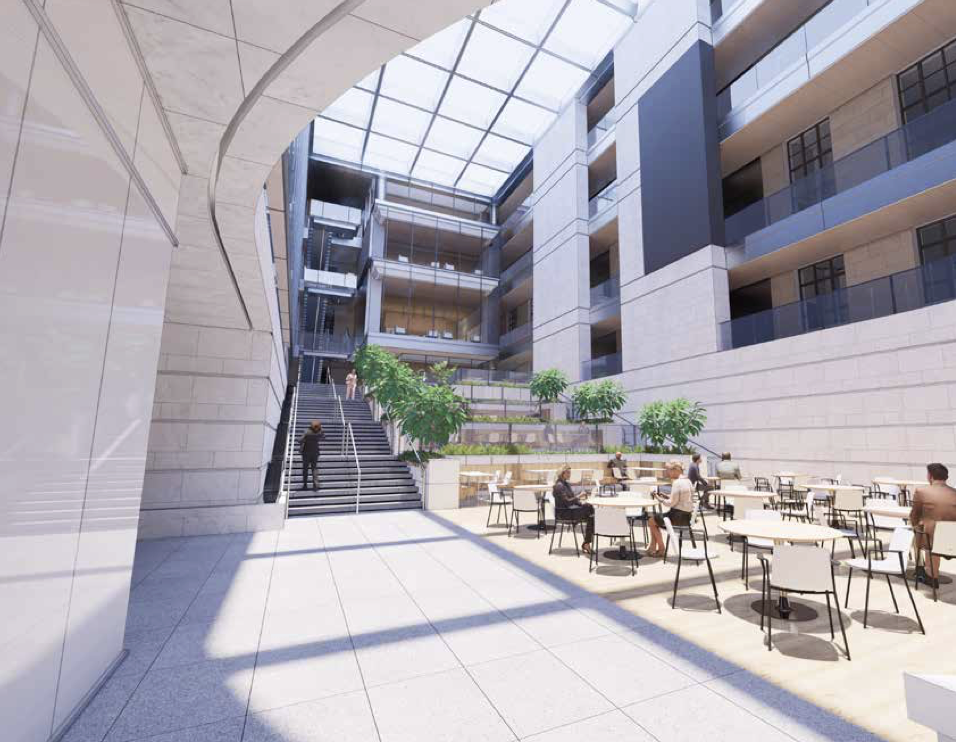 Inside, a planned atrium looks like something between a cruise ship and a Scandinavian prison. The addition of a skylight is a nice feature, hearkening back to one that once existed in the Eccles Building. But the blocky lines, cold tones, and Ikea-type furniture are completely at odds with the building’s architectural legacy.