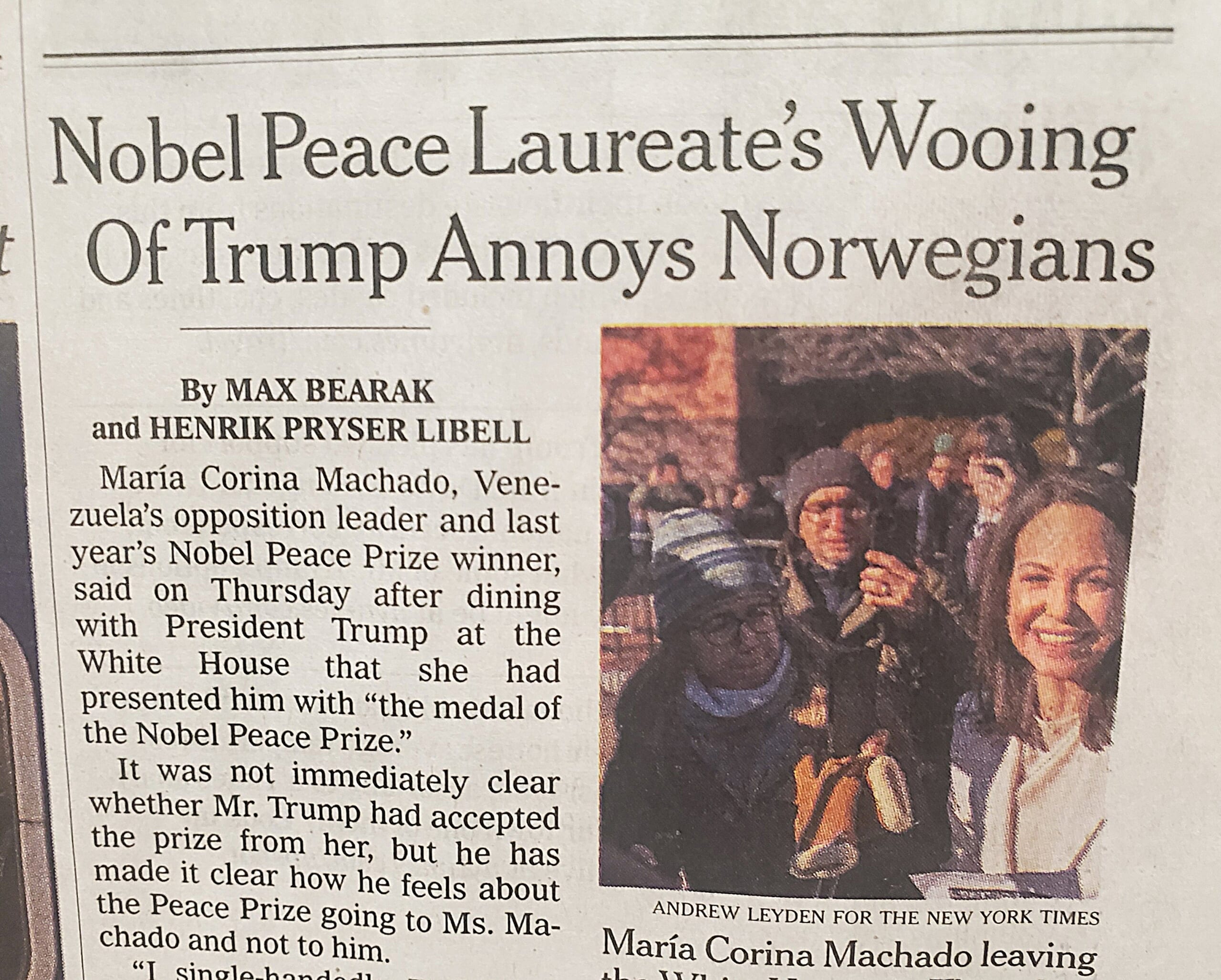 Ms. Machado “has dedicated her Peace Prize to a highly controversial president, to put it mildly,” Mr. Sveen said. “It is nearly universally accepted in Norway that Donald Trump attacks liberal democracy.”