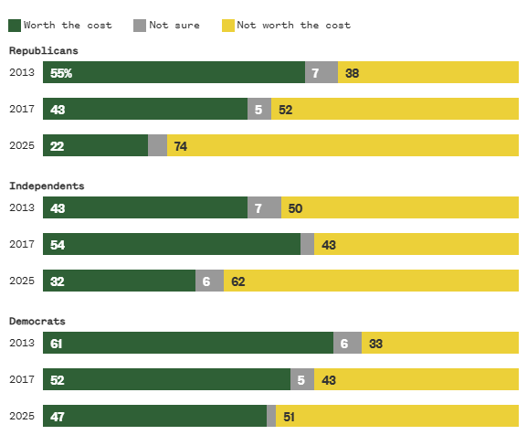 The 20-point decline over the last 12 years among those who say a degree is worth it — from 53% in 2013 to 33% now — is reflected across virtually every demographic group. But the shift in sentiment is especially striking among Republicans.