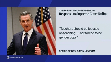 GEOFF BENNETT: California’s governor is criticizing the U.S. Supreme Court’s decision to temporarily block a state law banning public schools from outing transgender students to their parents. A spokesperson for Governor Gavin Newsom said ‘teachers should be focused on teaching, not forced to be gender cops.’