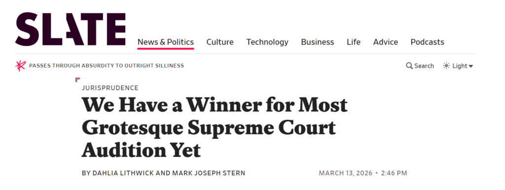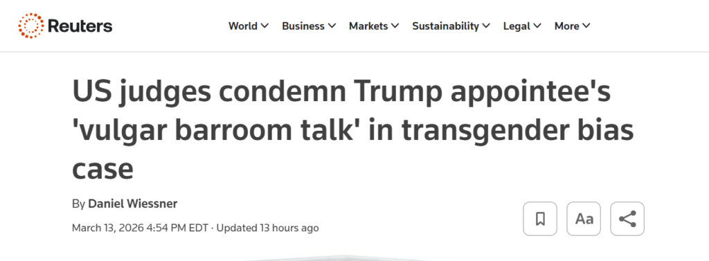 Reuters went with: “US judges condemn Trump appointee’s ‘vulgar barroom talk’ in their transgender bias case.” The article notes that 27 of VanDyke’s child-hating colleagues on his circuit “denounced VanDyke’s comments as ‘vulgar barroom talk’ that could undermine public trust in the courts” in a written response accompanying the opinions in the case.