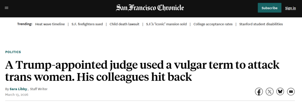 The San Francisco Chronicle might take the cake for most Orwellian headline on this story. It reads: “A Trump-appointed judge used a vulgar term to attack trans women. His colleagues hit back.”