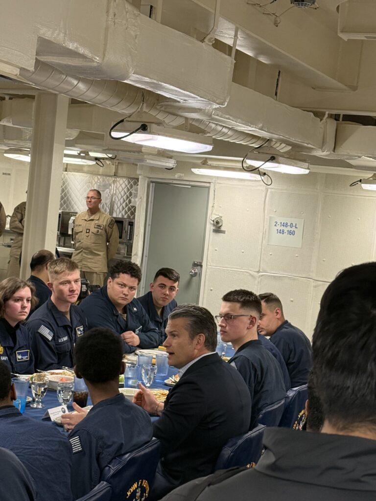 Hegseth eating with sailors aboard the PCU John F. Kennedy.