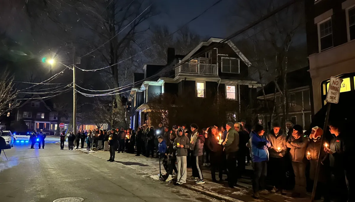 A crowd of people holding candles gather outside the home of Massachusetts Institute of Technology professor Nuno F.G. Loureiro in Brookline, Mass., Tuesday, Dec. 16, 2025. (AP Photo/Leah Willingham)