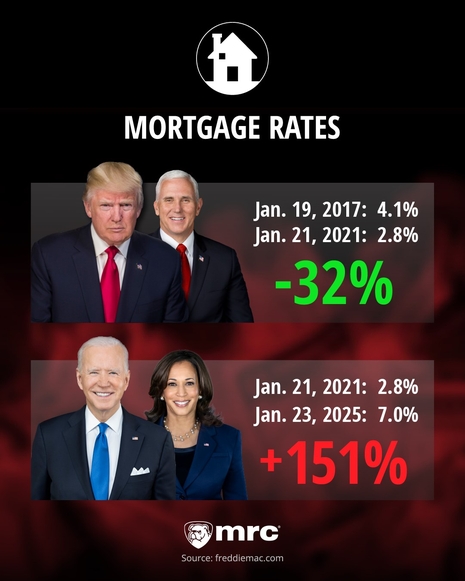 When President Donald Trump began his second term in the White House a year ago in January of 2025, 30-year fixed rate mortgages averaged 7.0%, more than four percentage points higher than the 2.8% average rate when he left office in January of 2021. During his first term, the average rate decline by 1.3 percentage points.