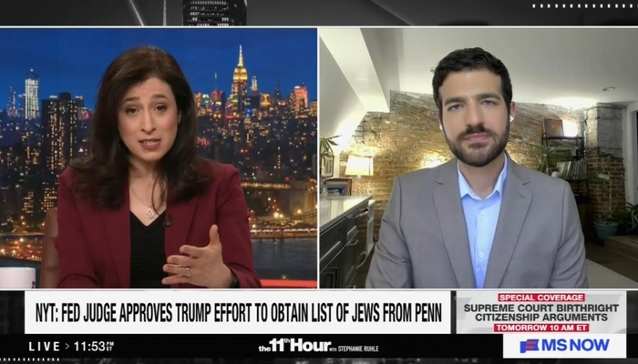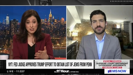 At the end of Tuesday night’s The 11th Hour on MS NOW, fill-in host Catherine Rampell, with guest Mark Joseph Stern, a liberal court writer for Slate and a member of the BlueSky Brigade, compared a Trump administration investigation into alleged antisemitism at UPenn to the Holocaust. Why? Because the admin asked for names of Jewish students on campus as part of the investigation.