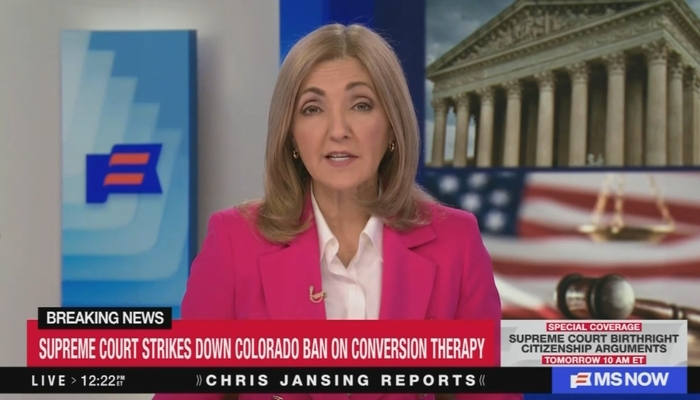 On Tuesday afternoon, in the aftermath of the U.S. Supreme Court striking down a Colorado law that bans conversion therapy for minors over their sexual orientation, MS NOW host Chris Jansing put on a negative spin, calling it “a major blow to LGBTQ rights.” She could just as easily have called it a victory for free speech.